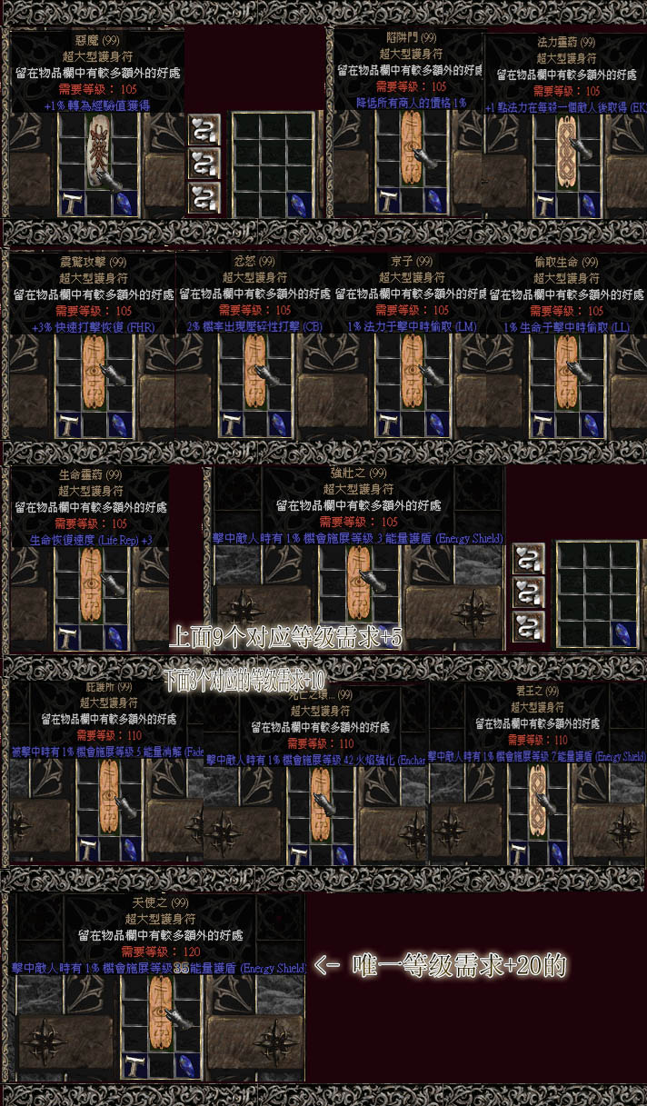 - 105级附魔护身符:只有巴尔,暗黑,尼拉塞克和几个99级场景能出,附魔后(冥府乌鸦/火炬/毁灭)的使用等级提高5级!