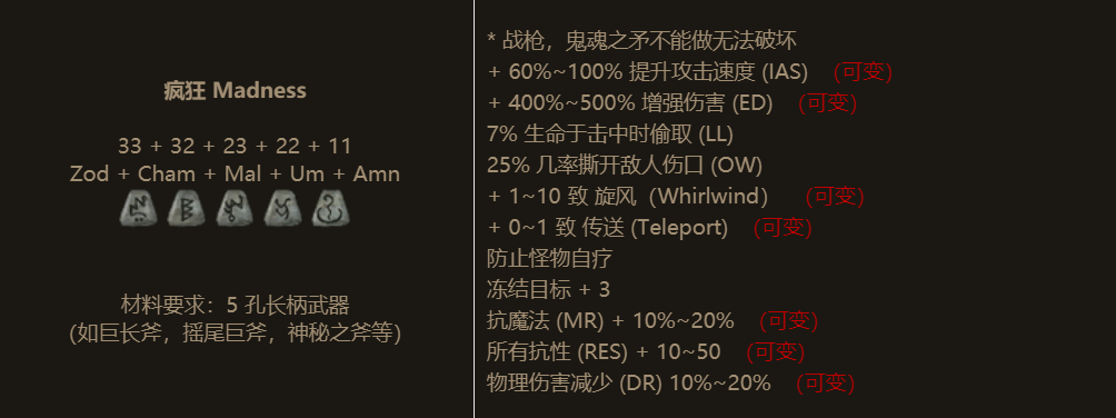 适用场景:几乎完美的一把武器,狼德的终极追究。要追求狼德的极限输出,武器只能锁定疯狂,底材只有神秘之斧、巨长斧、鲛尾巨斧三种可以选择。神秘之斧底材要洗到100%攻速,巨长斧96%攻速,鲛尾巨斧90%攻速(如有记错,欢迎指正)。