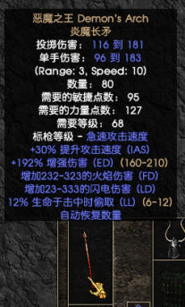 武器 |属性名称|最小值|最大值| |-|-|-| |增强伤害|30|50| |命中|100|150| |对恶魔增强伤害|100|150| |对恶魔命中|150|200| |对不死生物增强伤害|100|150| |对不死生物命中|150|200| |施法速度|10|10| |击中偷取生命|3|5| |击杀恢复生命值|3|6| |击杀恢复法力值|3|6| |获得魔法装备的几率|20|30| |命中|150|200| |施法速度|10|15| |攻击速度|15|25| |增强伤害|50|80| |击中偷取生命|6|8| |降低目标防御|40|60| |压碎打击|5|10| |致死打击|5|10| ...